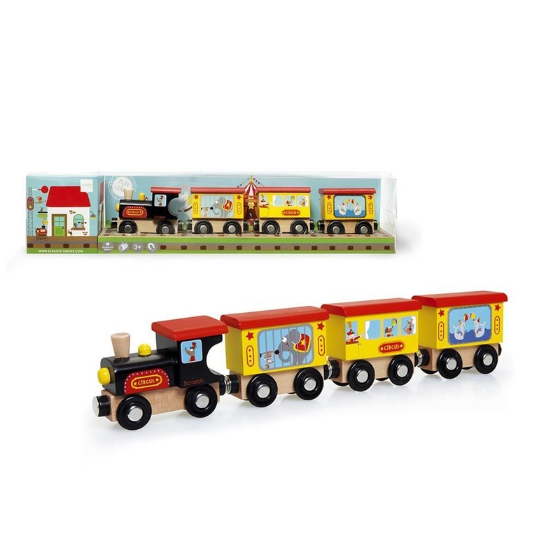 This magnetic wooden circus train goes all around the country to put on a dazzling show. Look, the animals are already practising hard in their carriages at the back! The lovely packaging with railway station and circus characters only adds to the fun. Let the show begin! All Scratch trains are compatible with the traditional wooden rails.
