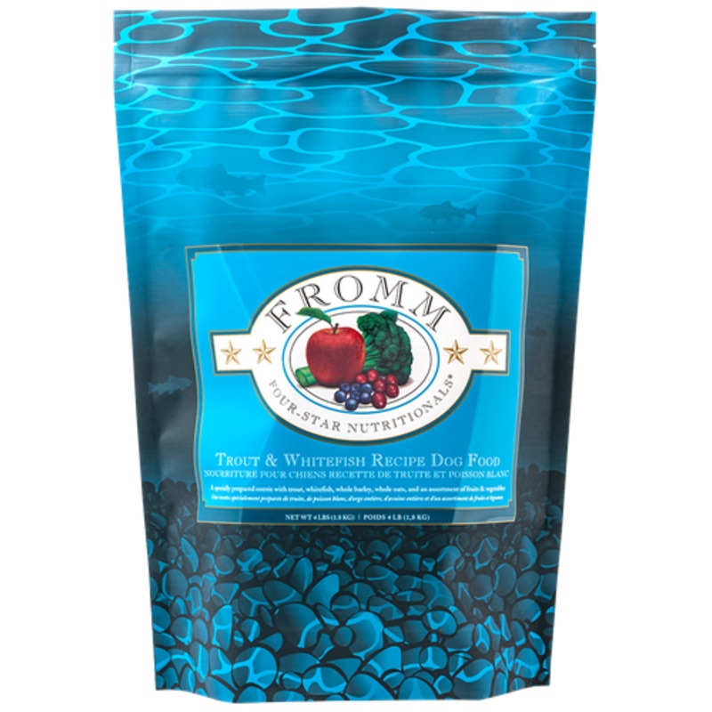 A specially prepared entre with trout, whitefish, whole barley, whole oats, and an assortment of fruits & vegetables.Fromm Four-Star Nutritionals Trout & Whitefish Recipe Dog Food is formulated to meet the nutritional levels established by the AAFCO Dog Food Nutrient Profiles for all life stages.