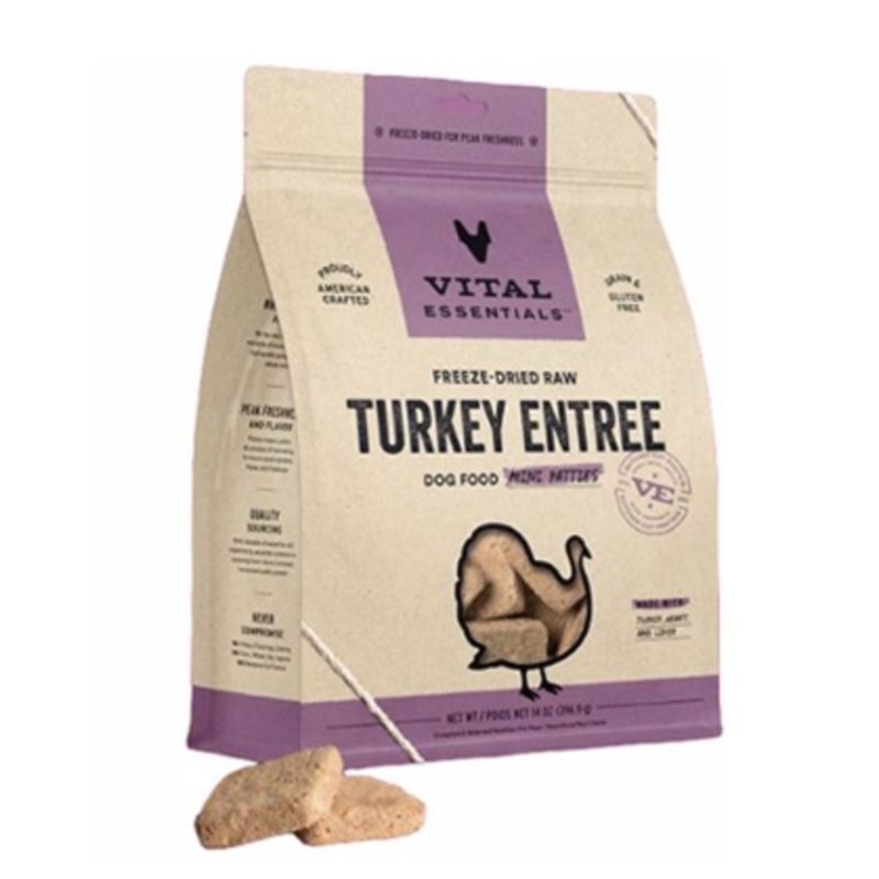 VITAL ESSENTIALS Turkey Mini Patties Freeze-Dried Raw Entree is a delicious and nutritious meal crafted for your canine companion. Made from high-quality turkey, these mini patties are packed with essential nutrients to support your dog's overall health an