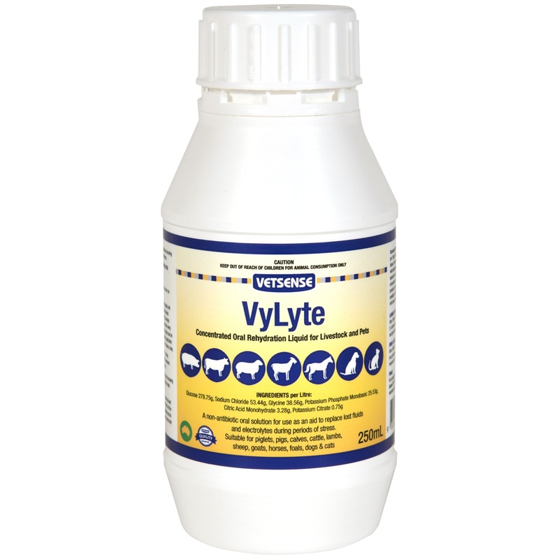 Vetsense VyLyteVetsense VyLyte is a non-antibiotic oral solution designed to replace lost fluids and electrolytes during periods of stress. It is suitable for a wide range of species, including piglets, pigs, calves, cattle, lambs, sheep, goats, horses, fo