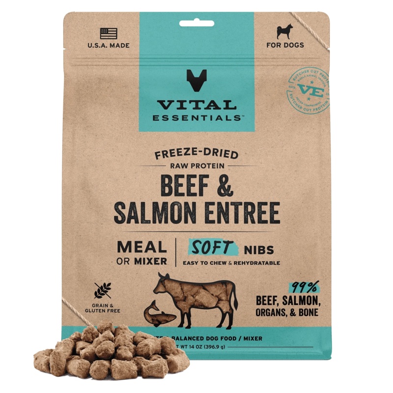 DescriptionGive your dog the best of land and sea with our freeze-dried raw Beef & Salmon Soft Nibs. Made with 99% raw protein from butcher cut beef, wild-caught salmon, organs, and bone. These tender morsels are perfect for sensitive teeth and entice pick