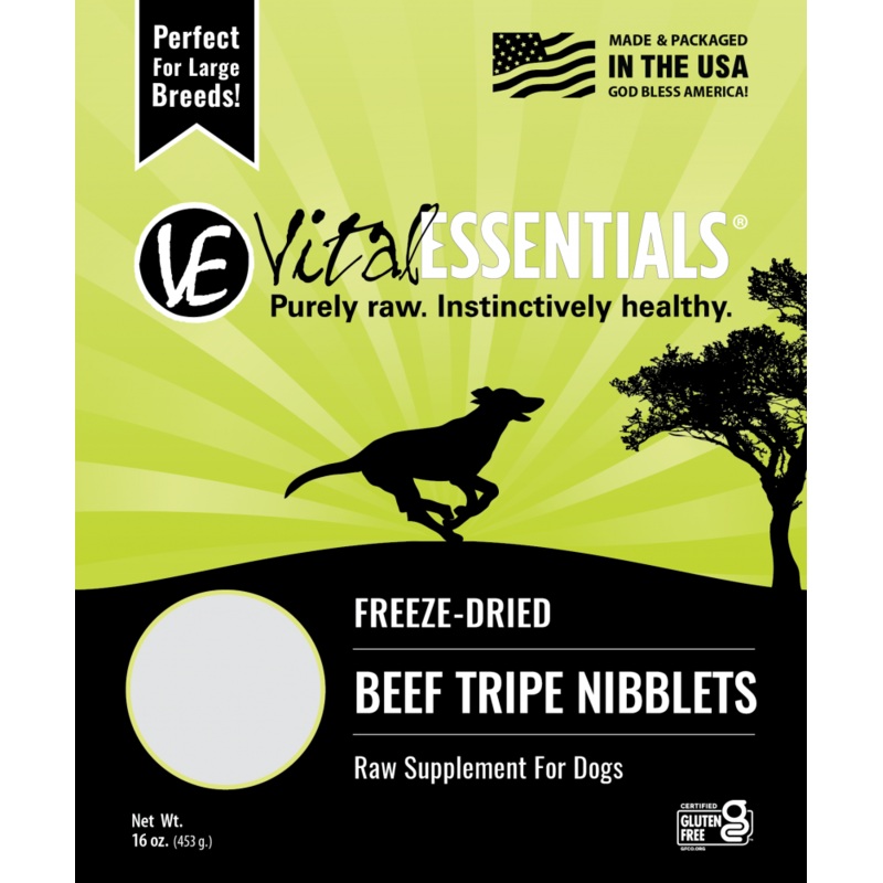 GRAIN FREE FOOD FOR YOUR DOG. Boost your dogs metabolism & immune system with Vital Essentials Green Tripe, the perfect nutritional supplement to promote digestive health. Green Tripe is a great source of probiotics, calcium, digestive enzymes, and much more.
