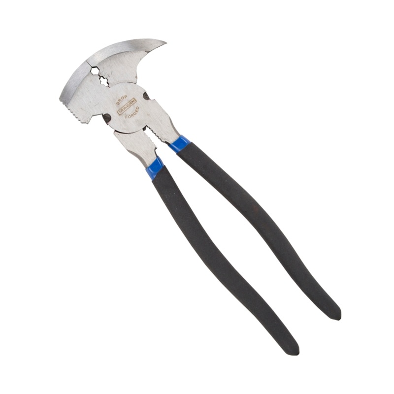 Model No: PC990-01. Expedite wire fence installation and dismantling with these 10 in. Fencing Pliers from Vulcan. This multi-tool lets you swiftly extract or insert fence-post staples and can cut, splice or stretch wires to simplify fence fixes. The hammer strike face is useful for pounding staples or bending crimped wires. It’s constructed with carbon steel for superb durability and fashioned with PVC grips for utmost comfort and control.