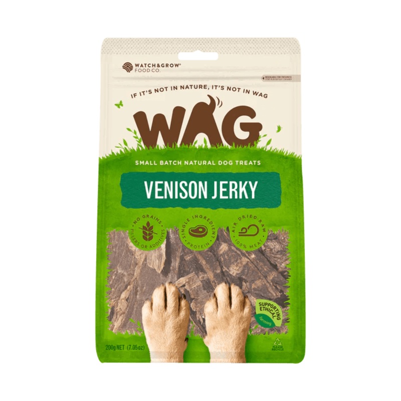 WAG Venison Jerky is the ultimate clean treat. Its 100% high in iron deer meat, lean for healthy tummies and rich in Omega-3 for good hearts. Venison is full of B Vitamins and natural enzymes to calm anxiety and soothe your doggos mind. No fillers, no addi