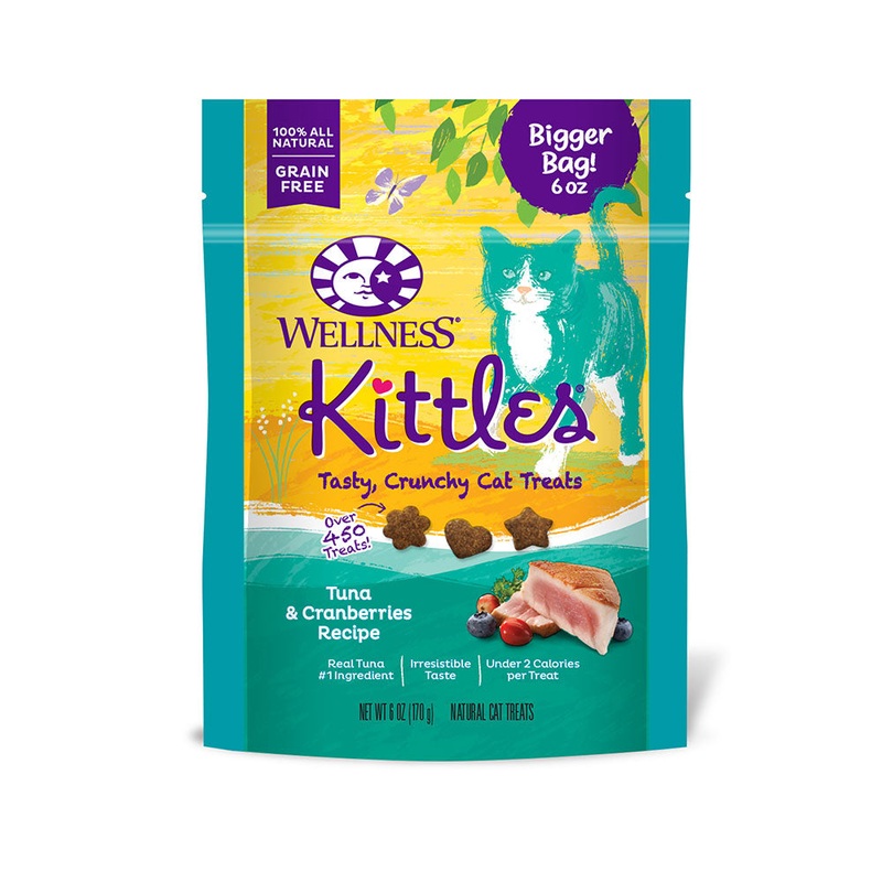 Indulge your cat with Wellness Kittles natural, grain-free crunchy cat treats. At only 2 calories per treat, Kittles are the purrfect way to show your kitty love. With 6 flavors to choose from, these crunchy bites are not only delicious, but help clean teeth too!.