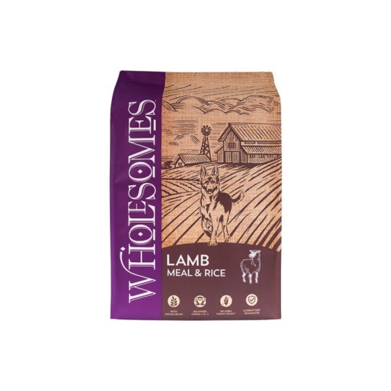 Wholesomes Lamb Meal & Rice Formula is designed to support the skin and coat needs of your dog using lamb meal as the principal source of protein. Formulated without common grains like corn, wheat or soybeans, Wholesomes Lamb Meal & Rice supplies your dog with a 100% complete and balanced diet for a healthy, active life. This tasty recipe is fortified with minerals and nutritionally balanced Omega-6 and Omega-3 fatty acids to promote good skin and a glossy coat, and contains natural vegetable fibers to support digestive health.