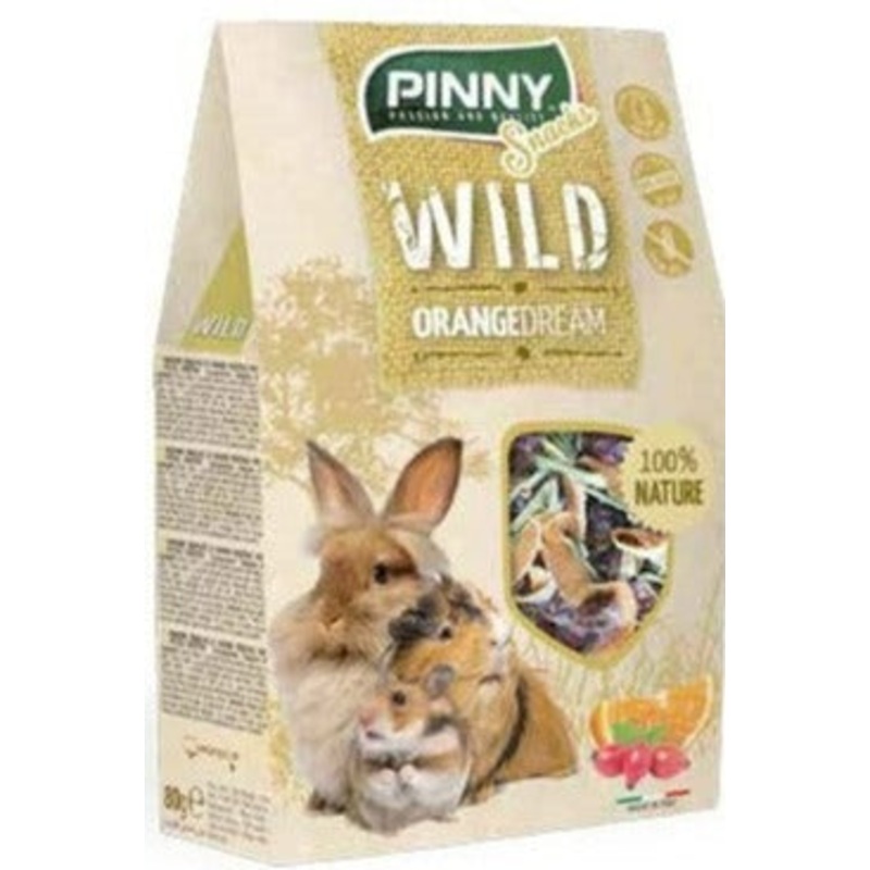 Wild Snack Orange Dream (Pinny) offers a delightful medley of rose hip, orange peel, and alfalfa for a tasty natural snack for small animals like rabbits and guinea pigs. These small animal treats are perfect for enriching their diets and providing variety