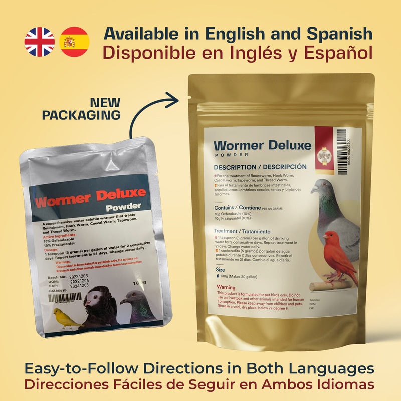 Wormer Deluxe Powder is a comprehensive water-soluble wormer for pet birds like pigeons, chickens, and cage birds. Wormer Deluxe Powder is an effective treatment Roundworm, Hookworm, Caecal Worm, Tapeworm, and Threadworm. Containing the active ingredients Oxfendazole, Praziquantel, and Levamisole, Wormer DeluxePowder will give you the piece of mind knowing your birds are treated with a safe and gentle wormer that’ll effectively treat most common worms.