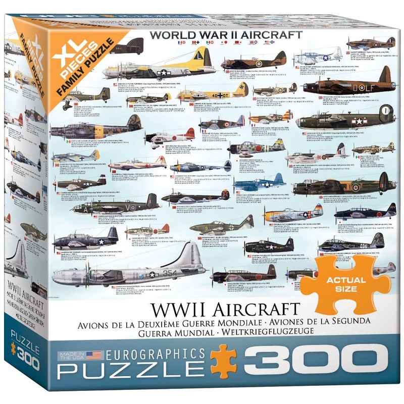 EuroGraphics WWII Aircraft 300-Piece Puzzle (Small box)Box size: 8" x 8" x 2.37". Finished Puzzle Size: 19.25" x 26.5".This unique jigsaw puzzle features aircraft of both the Allied and Axis forces, including many of the greatest warbirds such as the Hurri