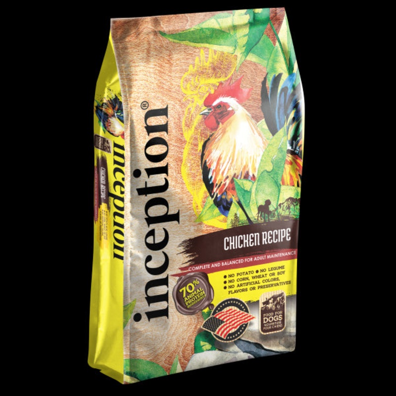 Available in other sizes 13.5 lb bag 27 lb bag ~ Inception Chicken Recipe for dogs uses chicken from the rolling hills of Minnesota, cage-free, thus having a positive effect on your dog's food. The oats used in inception come from the pristine oat fields o