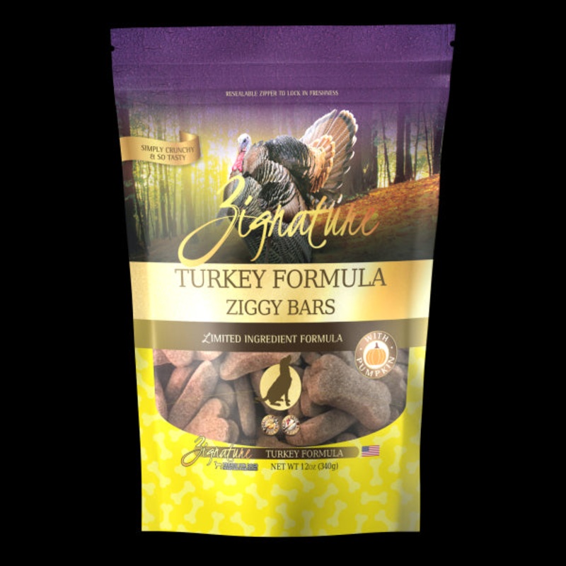 New Ziggy Bars Dog Treats offered in the brand?s 13 current dry dog food formulas. The bars were created with pumpkin known to be great for the sensitive digestive system and in effort to aid in training due its bite-sized morsel design.Zignature 12Oz Turk
