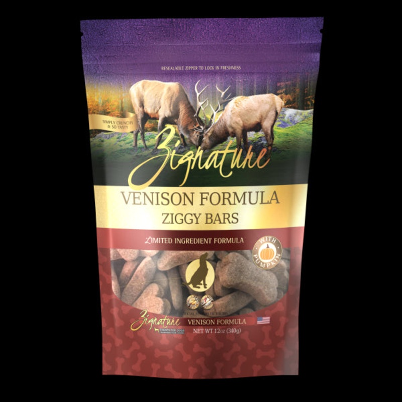 New Ziggy Bars Dog Treats offered in the brand?s 13 current dry dog food formulas. The bars were created with pumpkin known to be great for the sensitive digestive system and in effort to aid in training due its bite-sized morsel design.Zignature 12Oz Veni