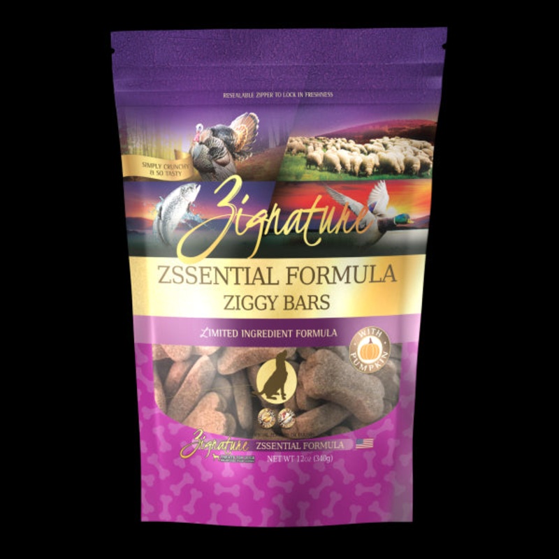 New Ziggy Bars Dog Treats offered in the brand?s 13 current dry dog food formulas. The bars were created with pumpkin known to be great for the sensitive digestive system and in effort to aid in training due its bite-sized morsel design.Zignature 12Oz Zsse