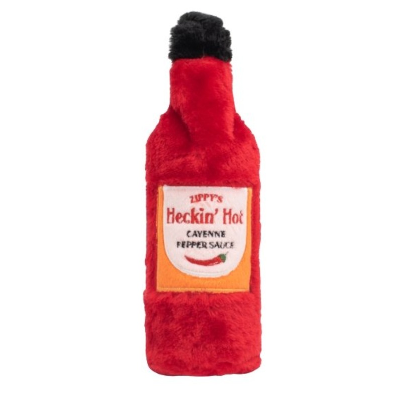 Turn up the fun (and the heat!) with theZippy Paws Hot Sauce Crusherz Heckin Hot dog toy. Designed just like the fan-favorite Happy Hour Crusherz, this fiery toy combines the irresistible crunch of a water bottle with the squeak of a reusable cap, keeping your pup entertained for hours. The soft hot saucethemed plush sleeve is reinforced with an extra fabric layer for durability, while the hook-and-loop closure makes bottle replacement quick and easy.